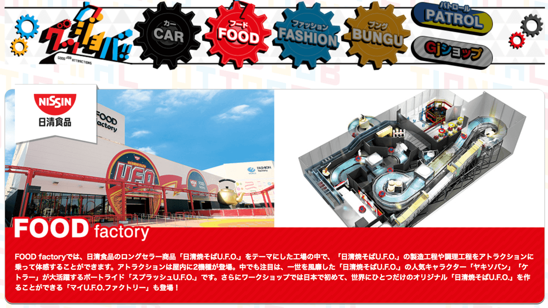 よみうりランドにあるFOOD factoryでは、「日清焼そばUFO」をテーマにしたアトラクションエリアがあります。